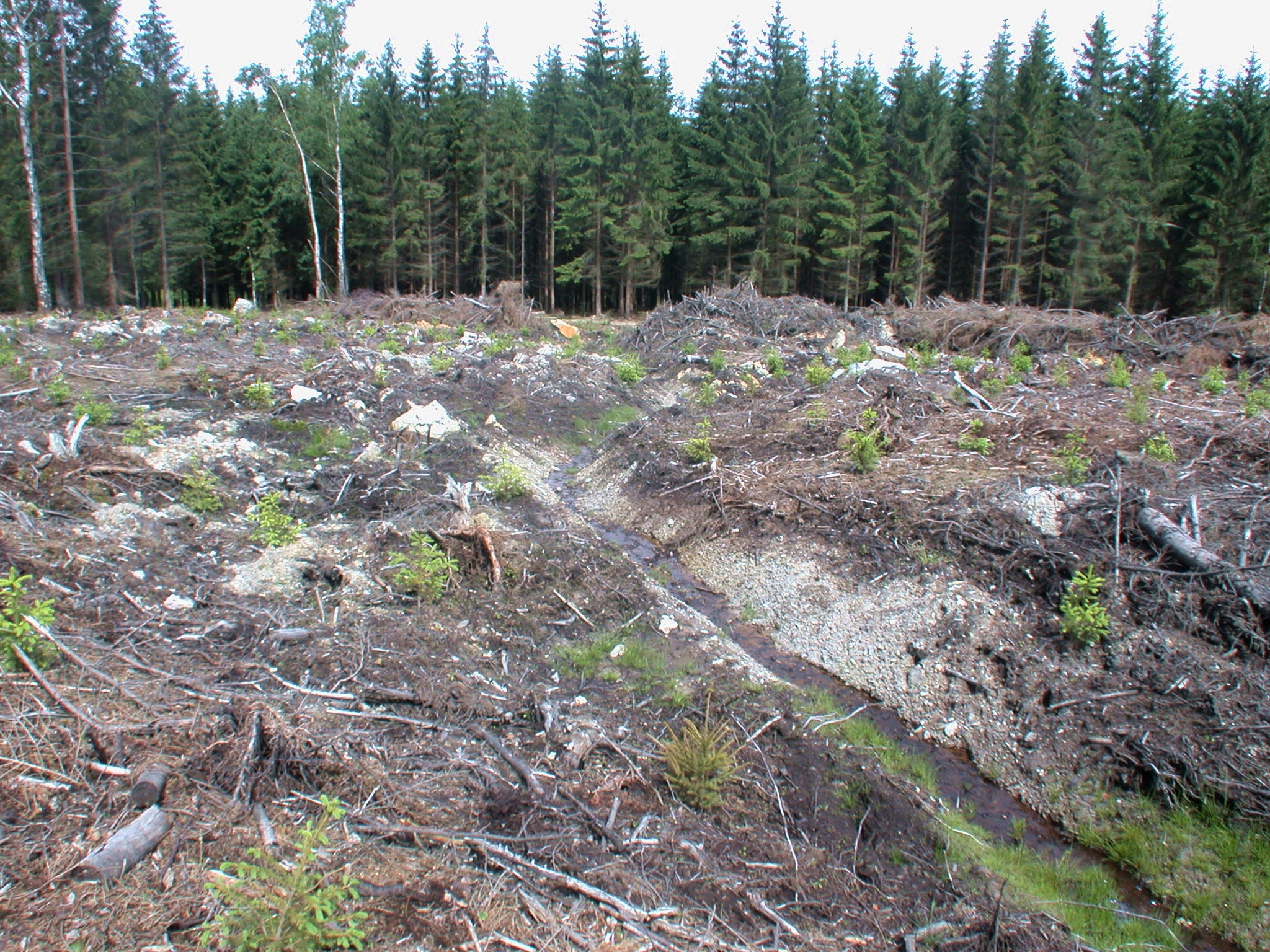 À partir du milieu du 19ème siècle, les pratiques agropastorales traditionnelles ont été progressivement abandonnées et l'action de l'homme est devenue systématique et très intense. Le drainage des zones humides de Haute-Ardenne s'est généralisé pour tenter d'installer des plantations intensives d'épicéas. Réalisé d'abord à la main, il s'est ensuite mécanisé sur les sols les plus portants (argile blanche). Même les sols à forte épaisseur de tourbe (> 1 mètre d'épaisseur) couverts de tourbières hautes actives ont finalement été plantés, mais ces tentatives se sont révélées trop aléatoires. Les sols les plus secs ont aussi été plantés massivement en résineux ou ont subi des amendements importants pour développer un pâturage intensif. |