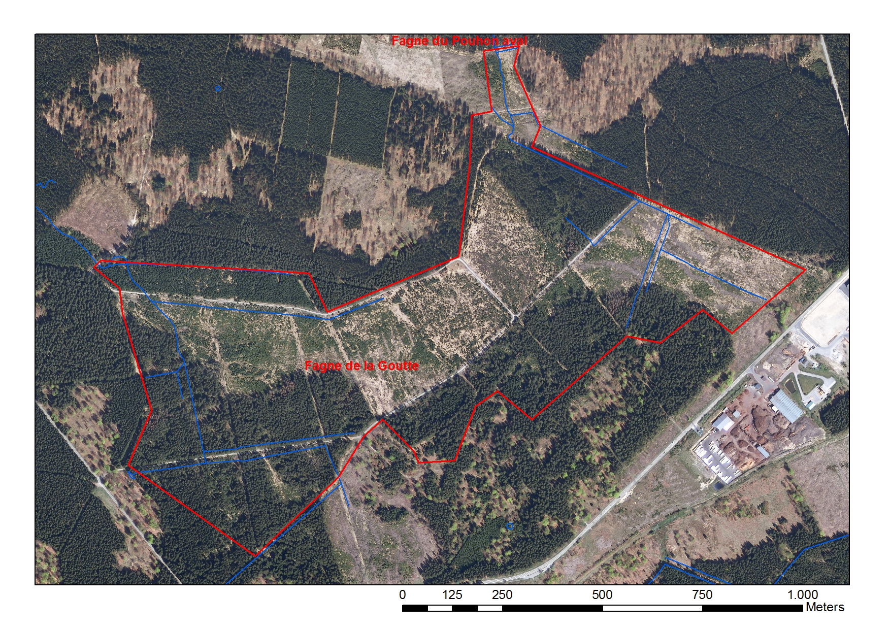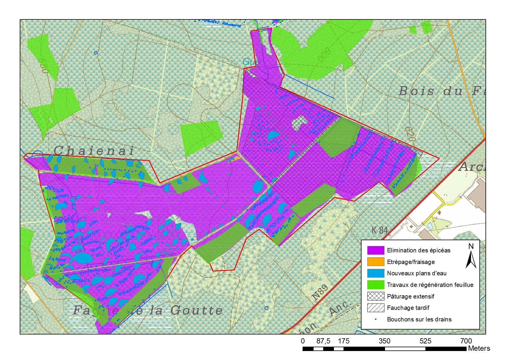 - Travaux de régénération feuillue (dans la zone déboisée et les hêtraies périphériques) : clôtures de protection, plantations et semis de feuillus.
