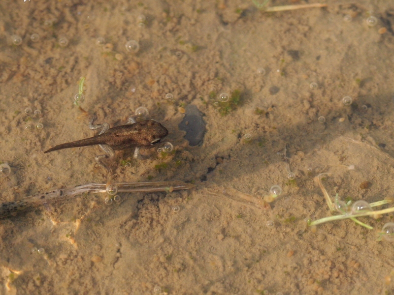 La ponte est une longue chaine de 1 à 2 m de long composée d'oeufs noirs, qui repose le plus souvent au fond de l'eau. Le têtard est noir et de petite taille, avec une tache claire sous la gorge.