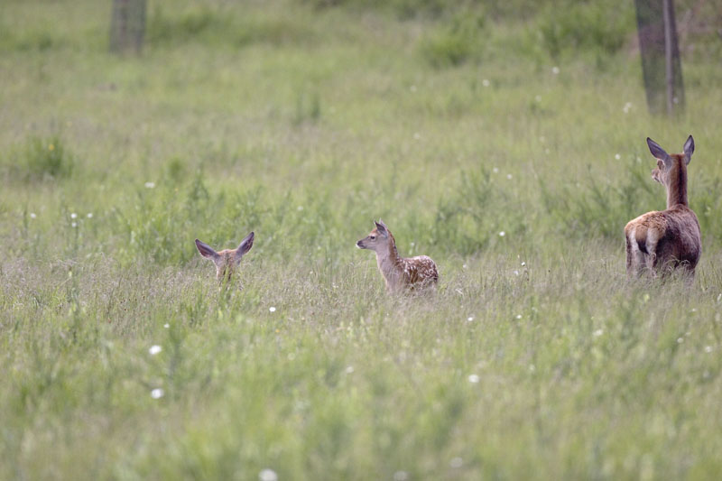 Cellule familiale composée d'une biche, d'une bichette (femelle d'un an) et d'un faon reconnaissable à sa livraie tachetée qu'il conserve jusqu'à l'âge de 3 mois. Le Cerf affectionne particulièrement les herbages mais ne néglige pas la végétation ligneuse.
