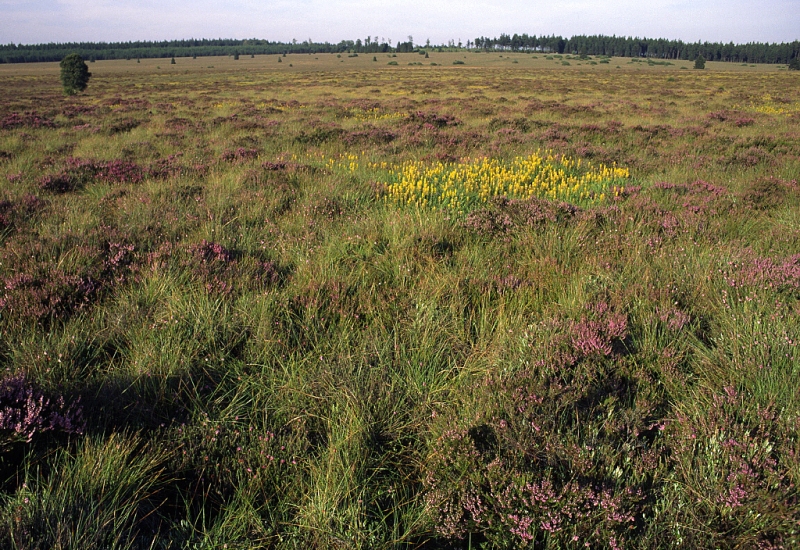 Phanérogames: Eriophorum vaginatum, E. polystachion, Erica tetralix, Calluna vulgaris, Andromeda polifolia, Vaccinium oxycoccos, V. uliginosum, Empetrum nigrum, Carex pauciflora (RR), Scirpus cespitosus subsp. cespitosus, Drosera rotundifolia, Narthecium ossifragum, Rhynchospora alba.
