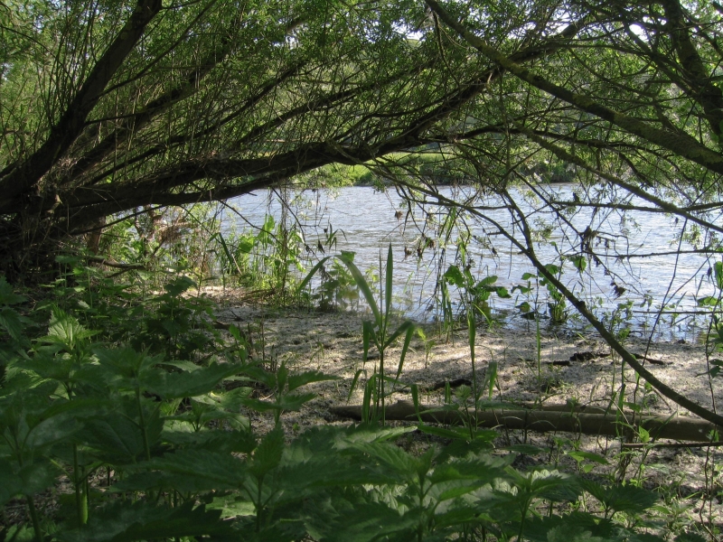 - derrière celui-ci, d'un fourré enchevêtré de saulaie (saules des vanniers, à trois étamines, blanc, fragile et leurs hybrides) garni de lianes ([Humulus lupulus], [Solanum dulcamara] et/ou [Calystegia sepium]).