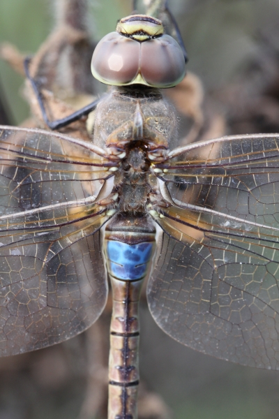 Le mâle se caractérise, entre autre, par un anneau brun sur le premier segement et une selle de couleur bleue généralement limitée à la partie supérieure du deuxième segment. Attention de ne pas le confondre avec le mâle d'Anax parthenope dont la tache bleue est plus étendue. Chez la femelle et les jeunes individus, la tache bleu est moins visible et généralement traversée par une bande médiodorsale noire.
