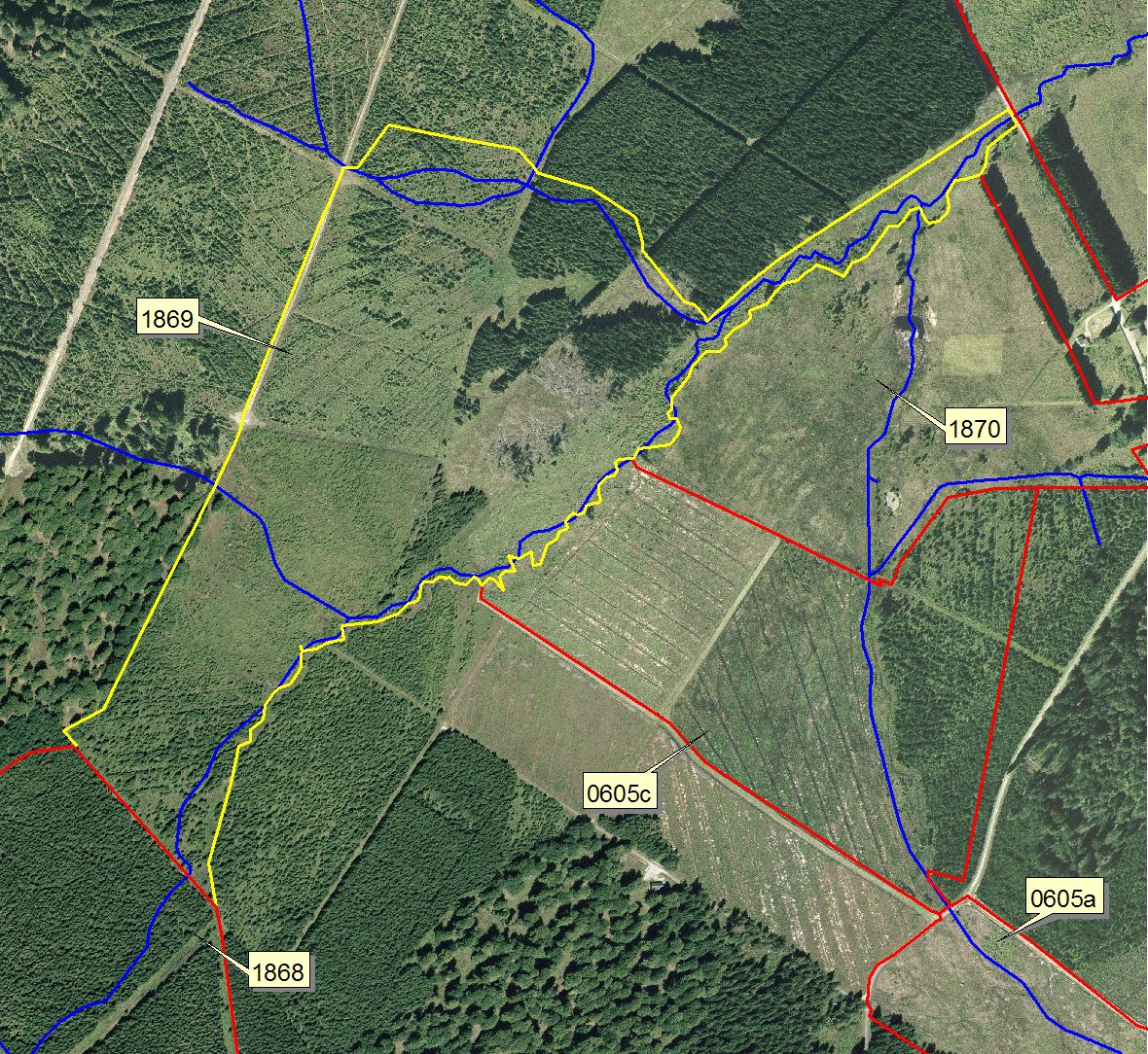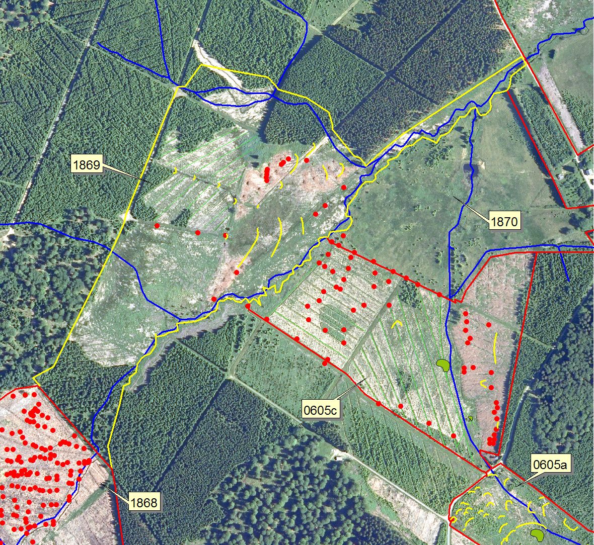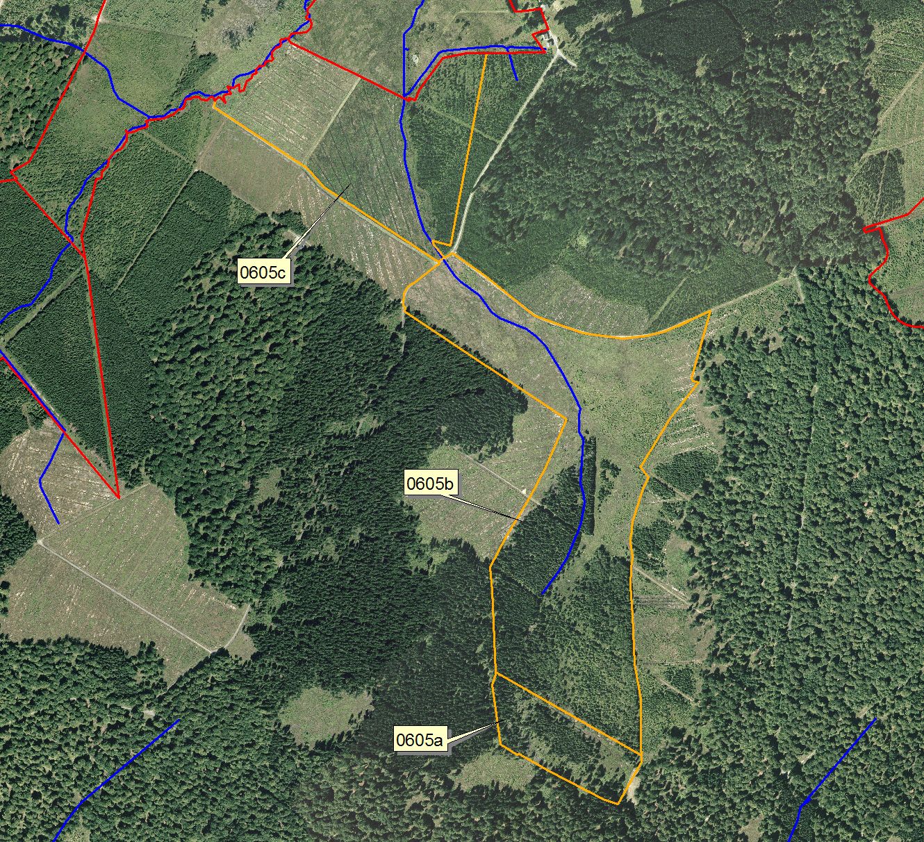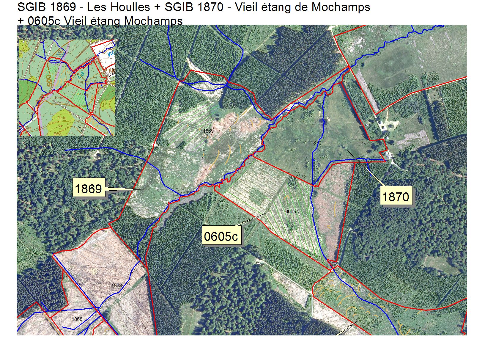 Le site est divisé en 3 parties pour les inventaires biologiques et pouvoir comparer dans le temps l'effet des travaux dans le site étrépé de Hourchamps (605a) avec les anciennes données. La partie b et c sont aussi bien différentes sur la nature des mares.