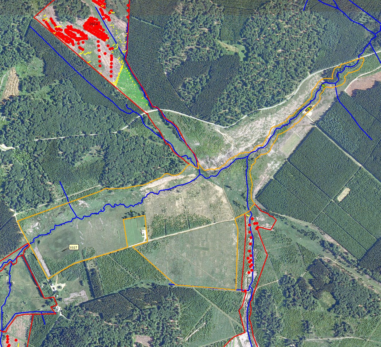 Le site en fin de projet (Ortho-2006) - Création de nombreuses mares (points rouge et polygones verts) et de digues (jaune); neutralisation de drains (lignes vertes) |