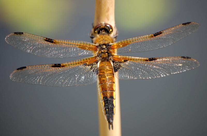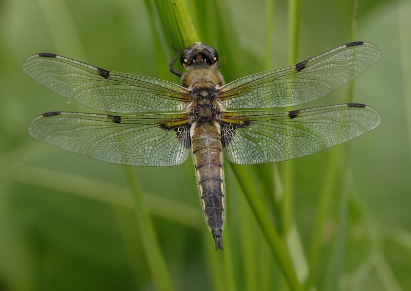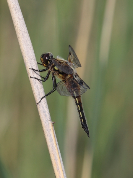 | Ecologie : | La Libellule à quatre taches se rencontre dans un grande diversité de milieux d'eaux stagnantes, tels les «vennen», les mares dans les landes, les bas-marais, les tourbières, les abreuvoirs à bétail, les étangs de pêche et même les mares de jardins. Elle montre une préférence pour les plans d'eau présentant une végétation aquatique dense et bien développée. La présence en abondance de Libellula quadrimaculata sur des «vennen», associée à l'absence d'autres espèces typiques de ce milieu, est un signe de mauvaise qualité du plan d'eau et indique généralement une acidification de celui-ci. Geert De Knijf et Philippe Goffart in Goffart et al. 2006 |