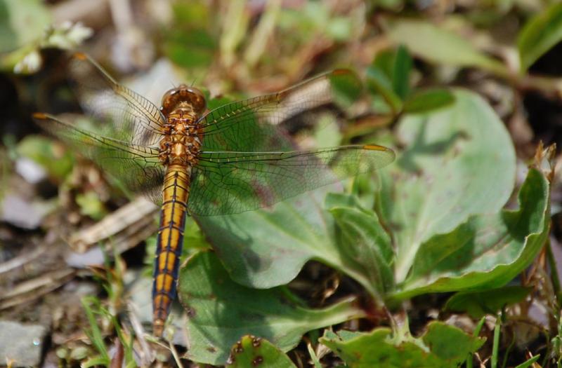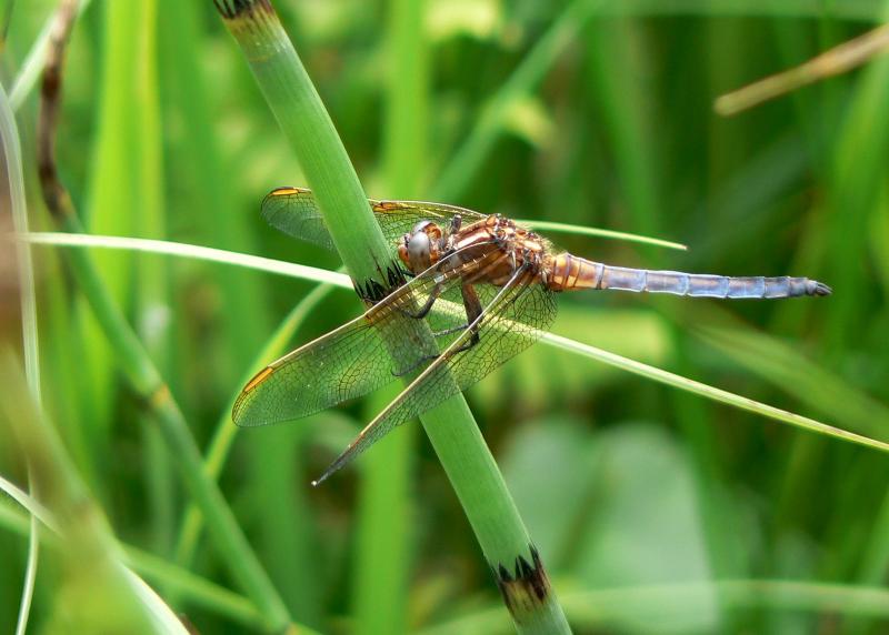 Chez cette espèce, le ptérostigma des ailes antérieures, long de 3 à 4 mm, est jaune ocre. Chez le mâle, le thorax est le plus souvent dépourvu de pulvérulence bleue, mais peut occasionnellement en être légèrement recouvert. Si tel est le cas, cette pulvérulence est moins épaisse que celle recouvrant l'abdomen. Son front est également brun sombre. On note également la présence de deux bandes claires sur l'avant du thorax.