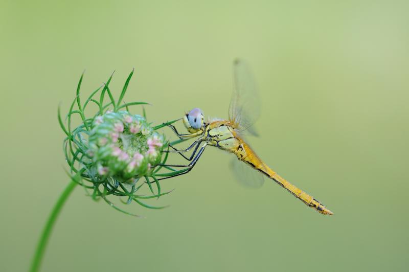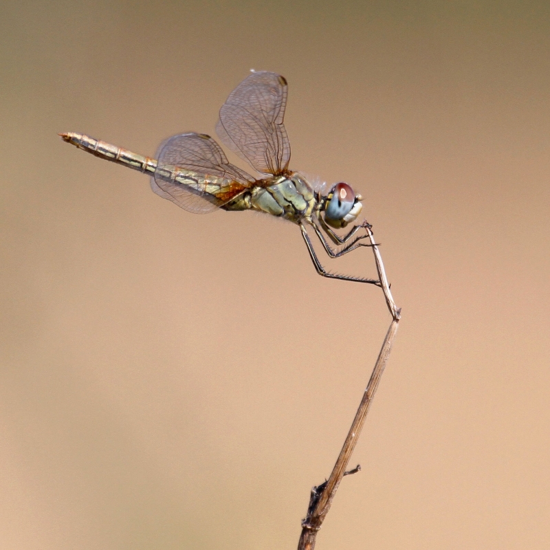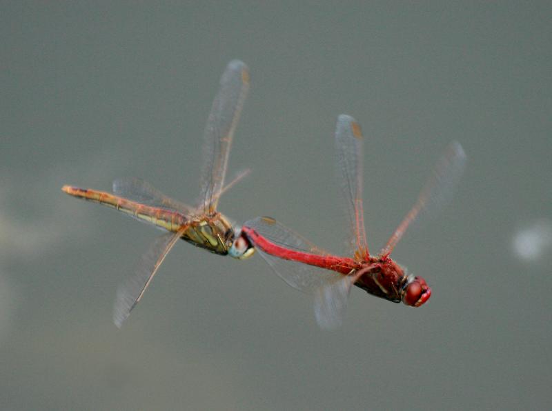 Sympétrum migrateur, le mâle très voyant est rouge brillant. Mâle et femelle ont des yeux rouges et bleu-gris dans la partie inférieure.