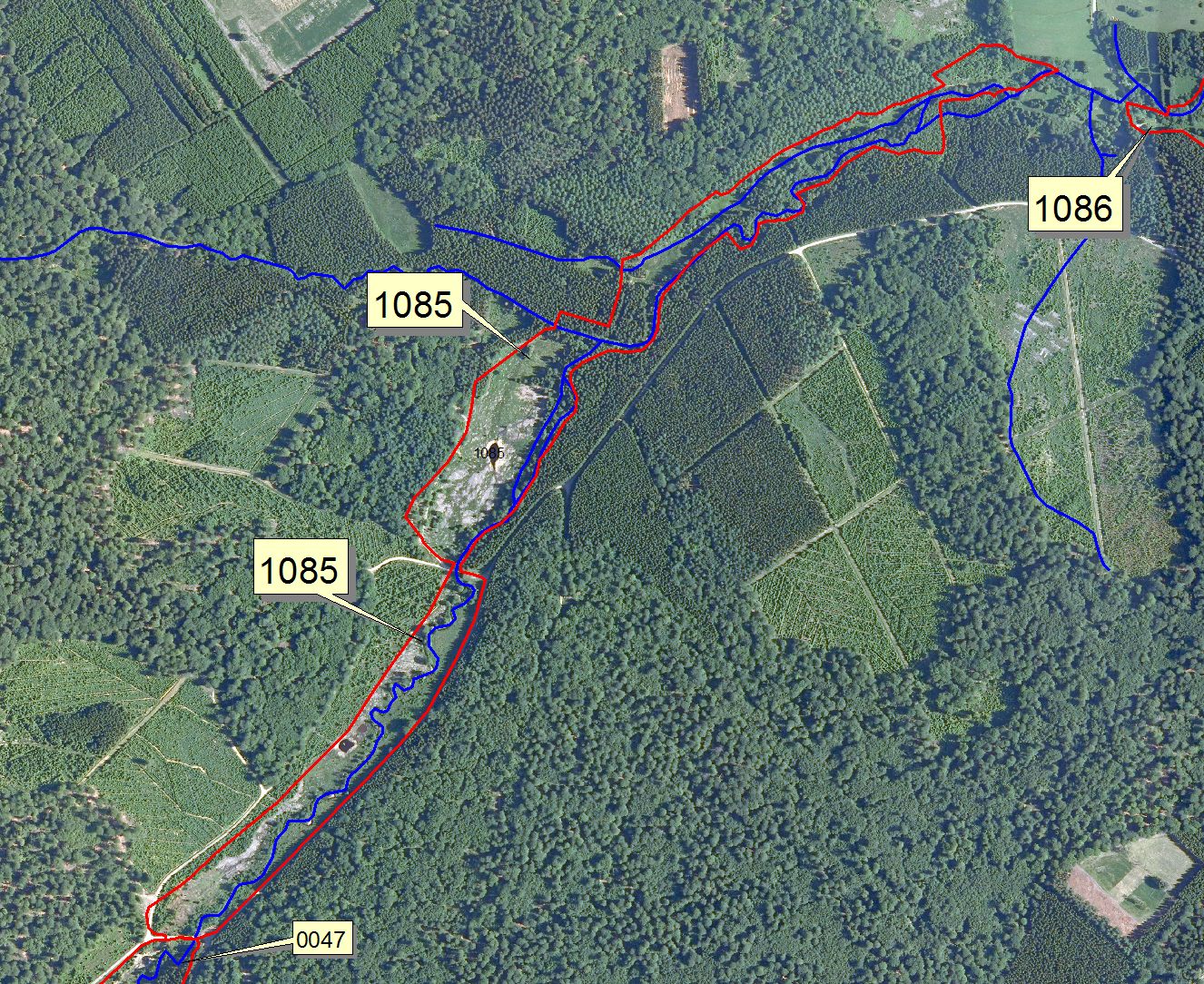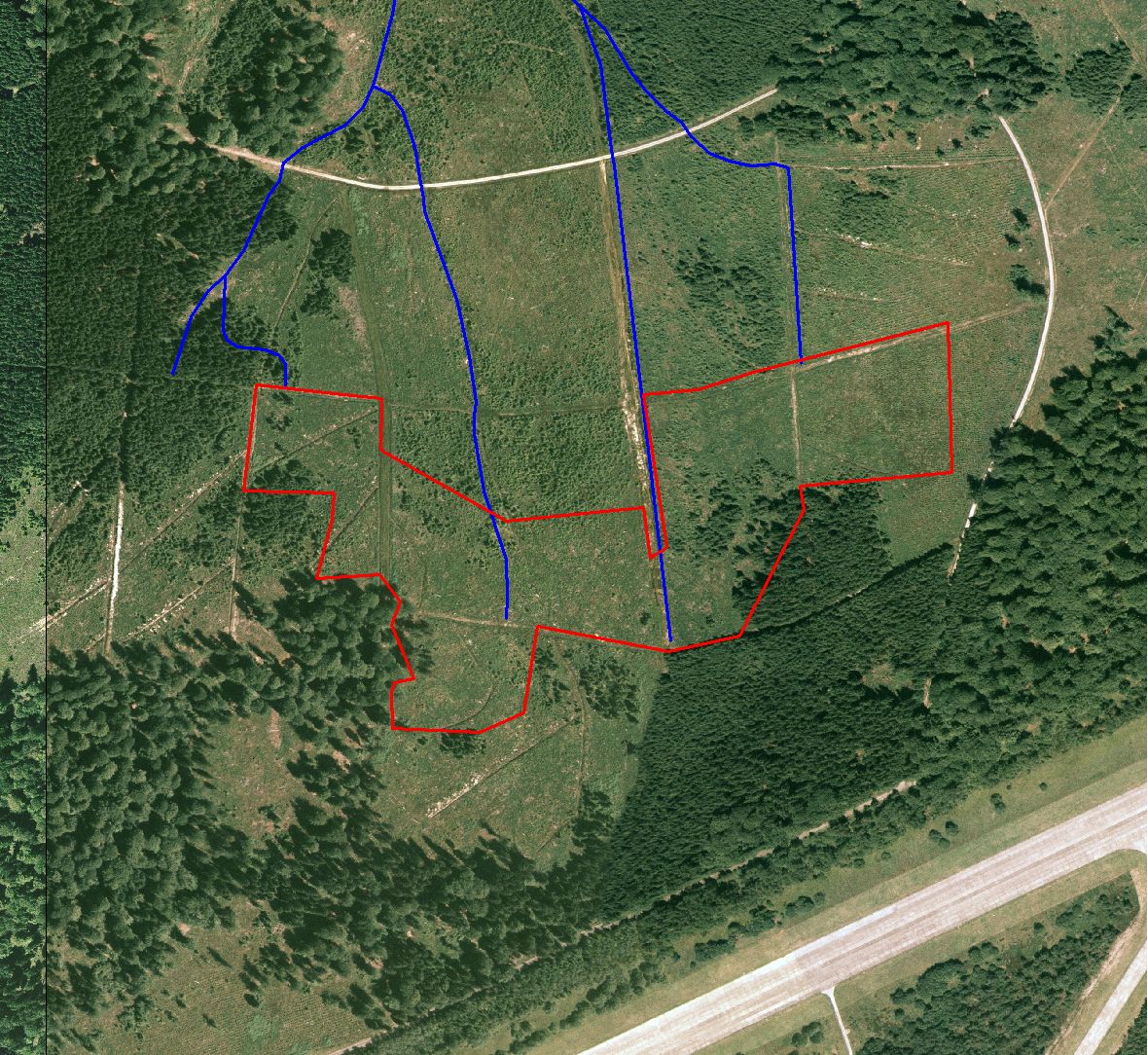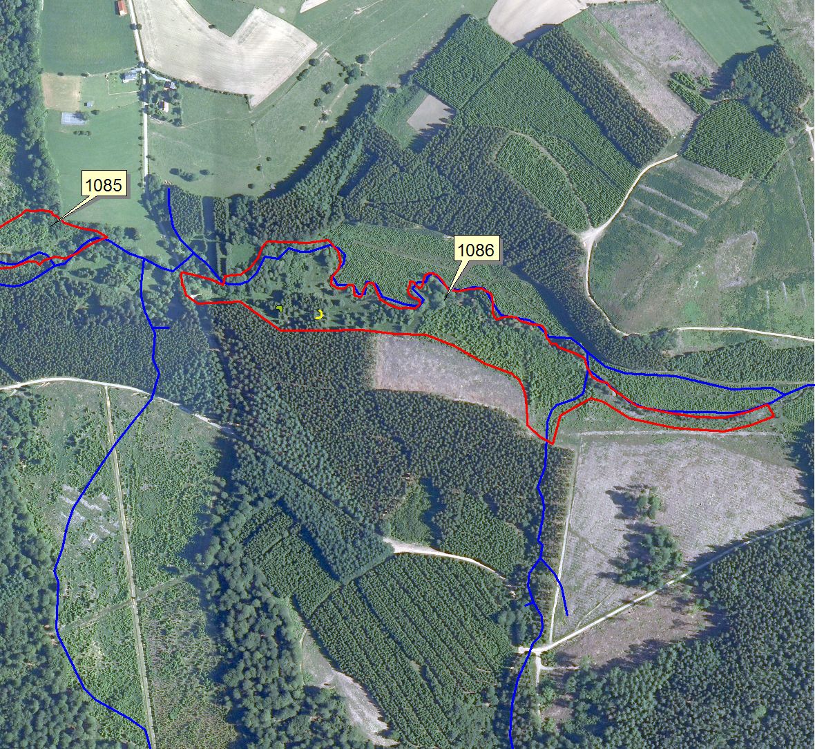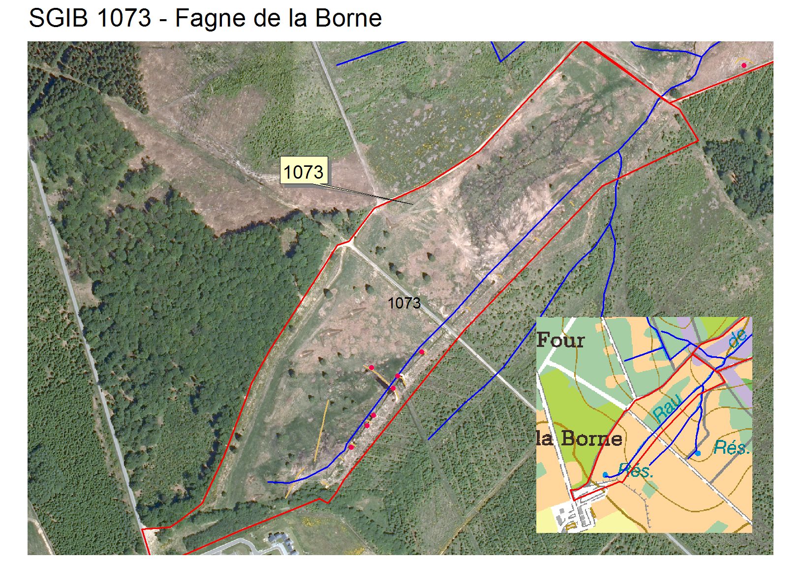 Vue aérienne (orthophoto de 2006). Comme le sité était déjà une RND en bon état de conservation, les travaux se sont limités à boryer ou à éliminer des épicéas en bordure du site initial et à creuser ne seule grande mare, au sud du site.