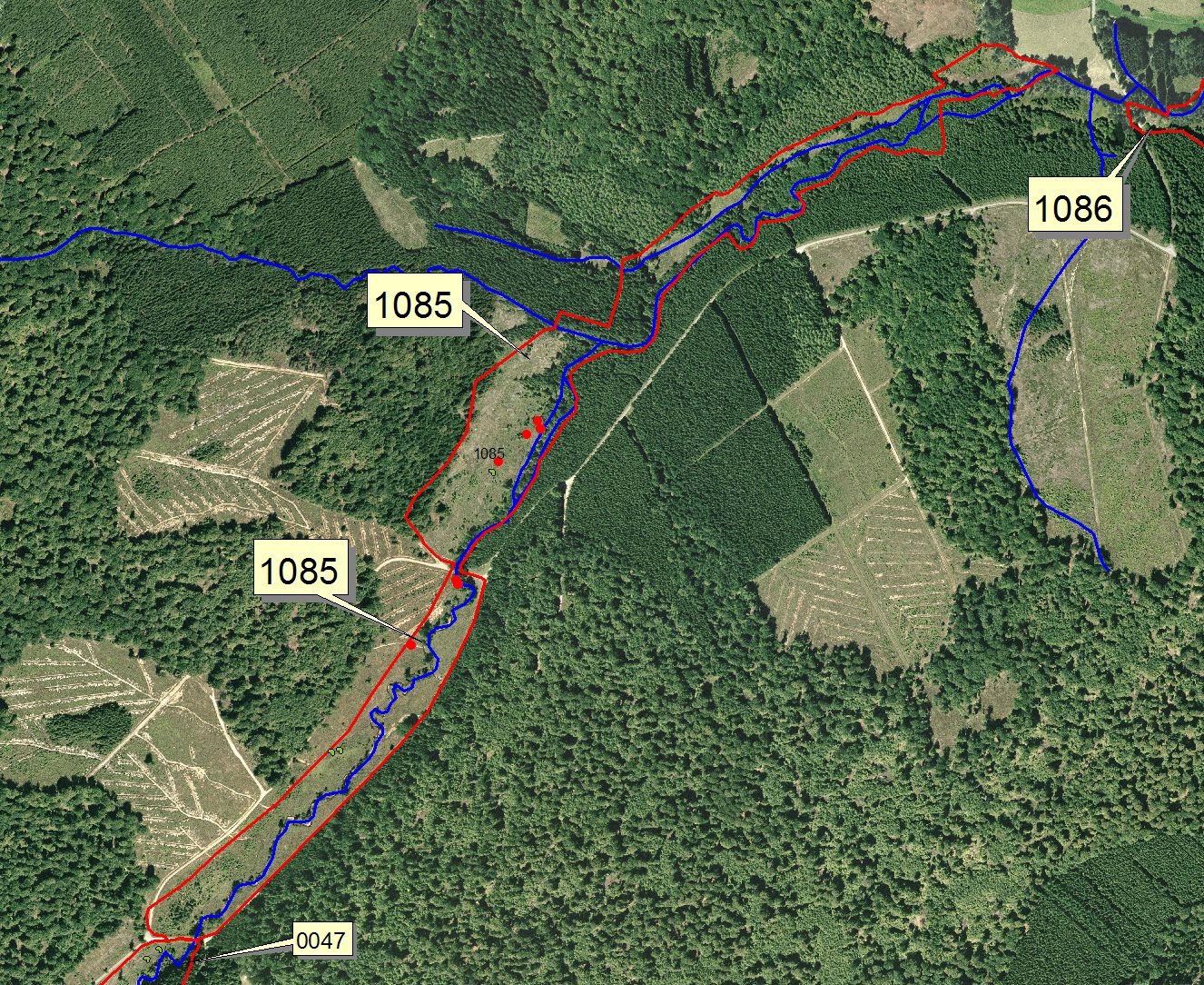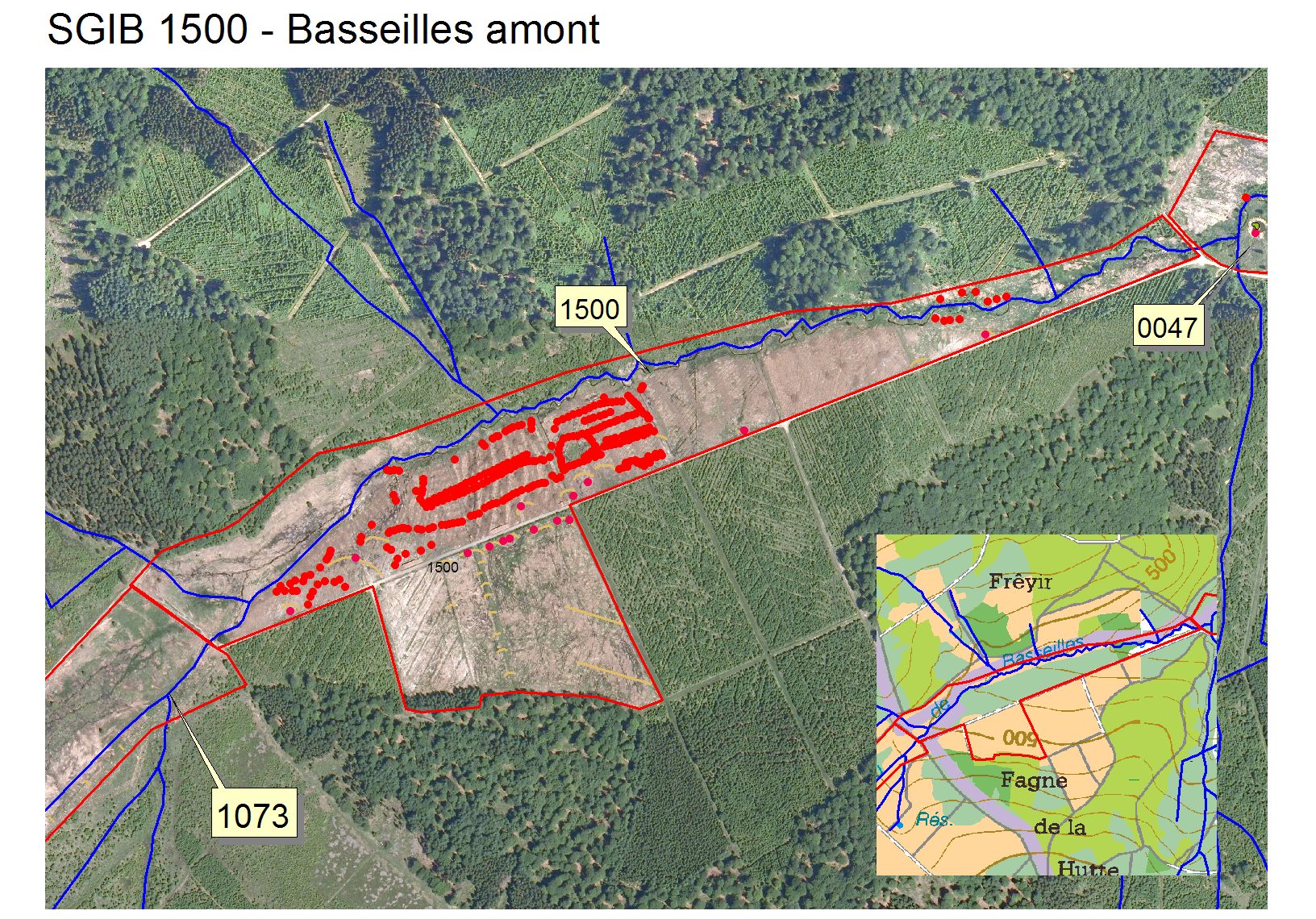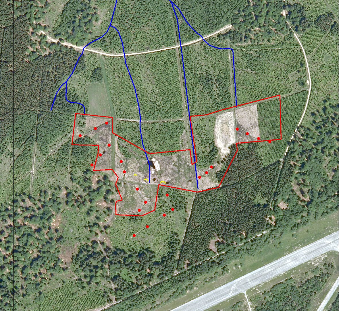 Vue aérienne (orthophoto de 2006). Les lignes jaunes indiquent les digues et les points rouges les mares creusées sur le drain. Le drain bleu qui traversait le site des sources vers l'aval est neutralisé.