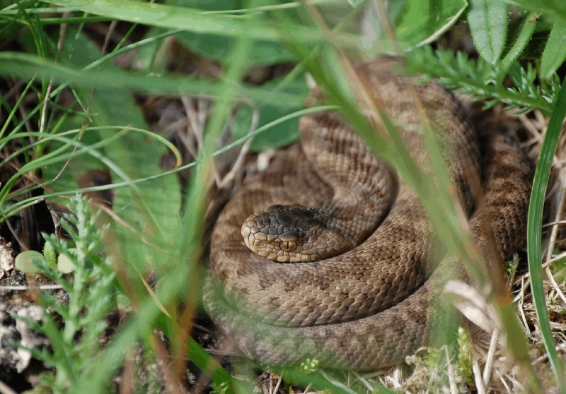 | Ecologie : | L'espèce fréquente des milieux très variés, secs, frais ou humides, qui sont peu fréquentés par l'homme et dont la végétation ne se développe que lentement : prairies en déprise agricole et friches diverses, landes à bruyères et genêts, abords de voies ferrées, lisières forestières, bordure de fourrés... Cycle de vie: Espèce vivipare, active de février à octobre. Accouplements en avril-mai. Mises-bas en août-septembre. Maturité sexuelle atteinte à 3-4 ans. Longévité voisine de 15 ans, rarement 20 ans. Seul serpent venimeux présent en Wallonie, la Vipère péliade ne mord que très rarement et uniquement pour se défendre, par exemple lorsqu'on la piétine ou que l'on tente de l'attraper (ce qui est d'ailleurs interdit !). Les jeunes consomment surtout des lézards, les adultes se nourrissent principalement de petits rongeurs. |
